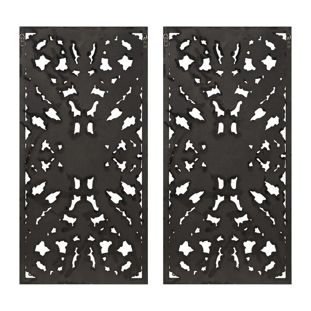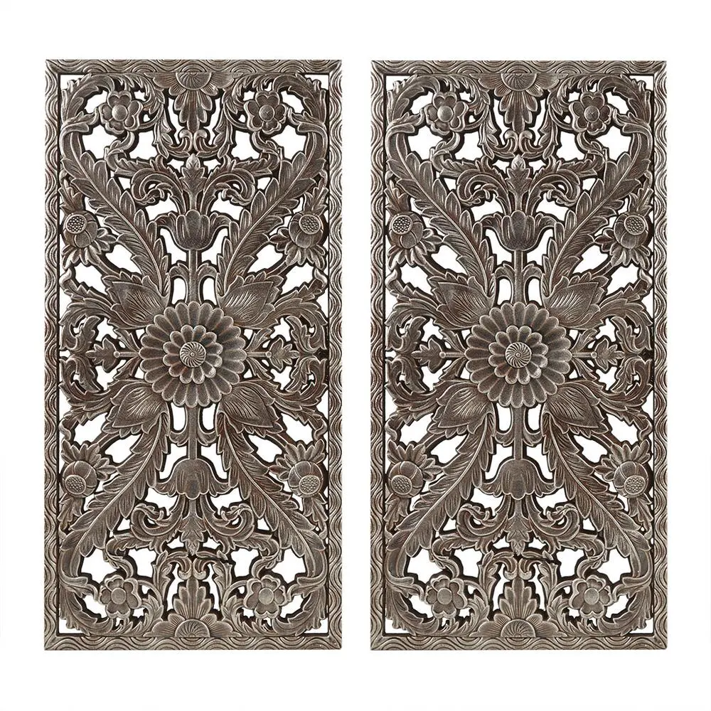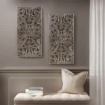 Complete your home decor with our Madison Park Botanical Panel Distressed Carved Wood 2-piece Wall Decor Set. This wall decor set features exquisite carved global botanical designs in a durable MDF material creating beautiful texture and dimension, while an antique silver and bronze coat finish adds a unique color and luster. Each piece is finished with two D-rings on the reverse making it easy to hang pieces, either side by side for a more clean look or staggered for a more stylized approach. Perfect for any Living Room, Dining Room, or Entry way – this carved wood panel 2 piece set is the perfect elegant touch to any decor.