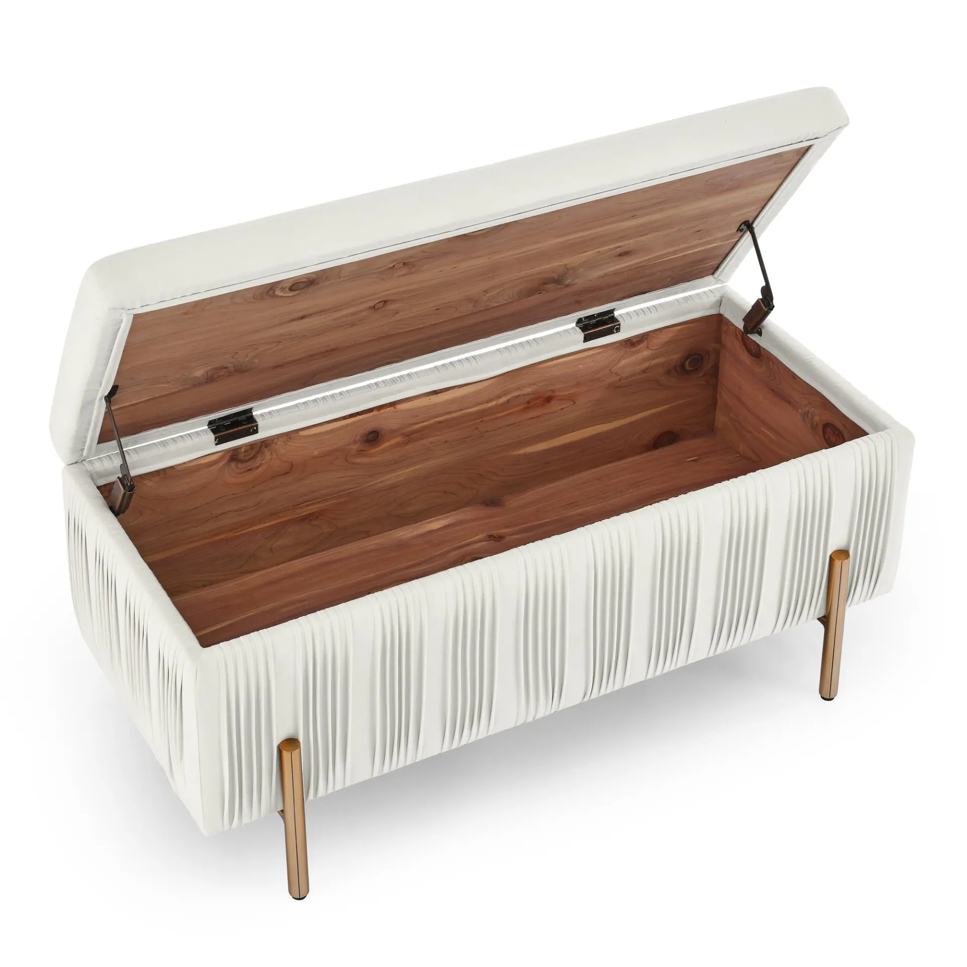 Elegant Upholstered Velvet Storage Bench with Cedar Wood Veneer, Large Storage Ottoman with Electroplate Iron Legs for Hallway Living Room Bedroom, Beige
